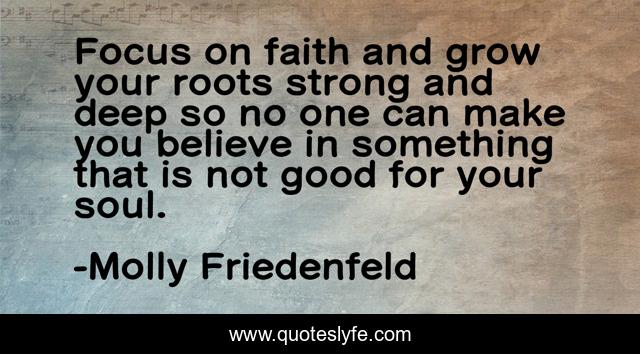 This page presents the quote "Focus on faith and grow your roots strong and deep so no one can make you believe in something that is not good for your soul.". Author of this quote is Molly Friedenfeld. This quote is about lessons, faith, life, focus, soul, growth-life, strong, roots, inspiration,.