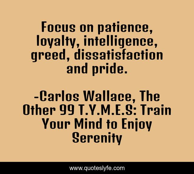 "Carlos Wallace, The Other 99 T.Y.M.E.S: Train Your Mind to Enjoy Serenity Quotes." Quoteslyfe.com, 2025. Tue. 09 Dec. 2025. <https://www.quoteslyfe.com/quote/Focus-on-patience-loyalty-intelligence-greed-dissatisfaction-186322>.