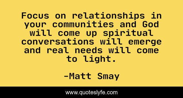This page presents the quote "Focus on relationships in your communities and God will come up spiritual conversations will emerge and real needs will come to light.". Author of this quote is Matt Smay. This quote is about missional, missional-communities, incarnational, incarnational-communities, jesus,.