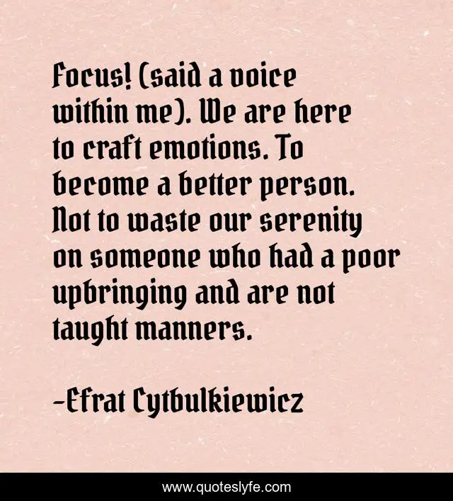 This page presents the quote "Focus! (said a voice within me). We are here to craft emotions. To become a better person. Not to waste our serenity on someone who had a poor upbringing and are not taught manners.". Author of this quote is Efrat Cytbulkiewicz. This quote is about spiritual-growth, self-awarness, spiritual-wisdom, self-determination, self-strength, self-growth, self-love, focus, spirituality,.