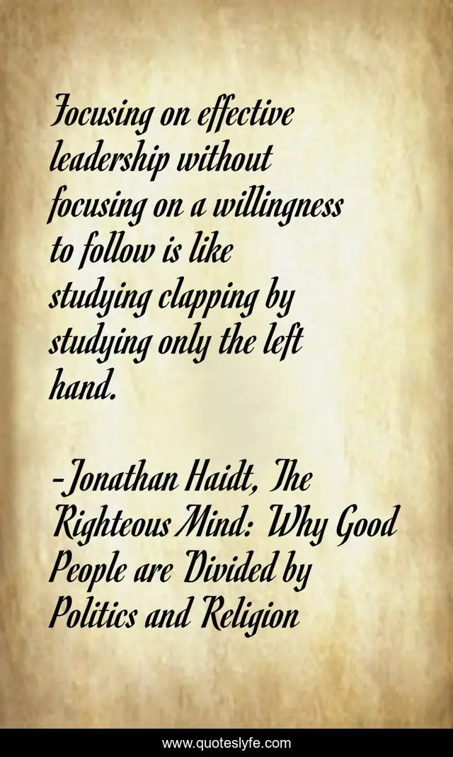 This page presents the quote "Focusing on effective leadership without focusing on a willingness to follow is like studying clapping by studying only the left hand.". Author of this quote is Jonathan Haidt, The Righteous Mind: Why Good People are Divided by Politics and Religion. This quote is about division, discipleship, submission,.