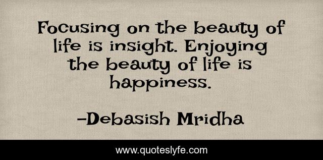 This page presents the quote "Focusing on the beauty of life is insight. Enjoying the beauty of life is happiness.". Author of this quote is Debasish Mridha. This quote is about philosophy, beauty, insight, debasish-mridha, quotes, inspirational, enthusiasm, beauty-of-life, debasish-mridha-m-d,.