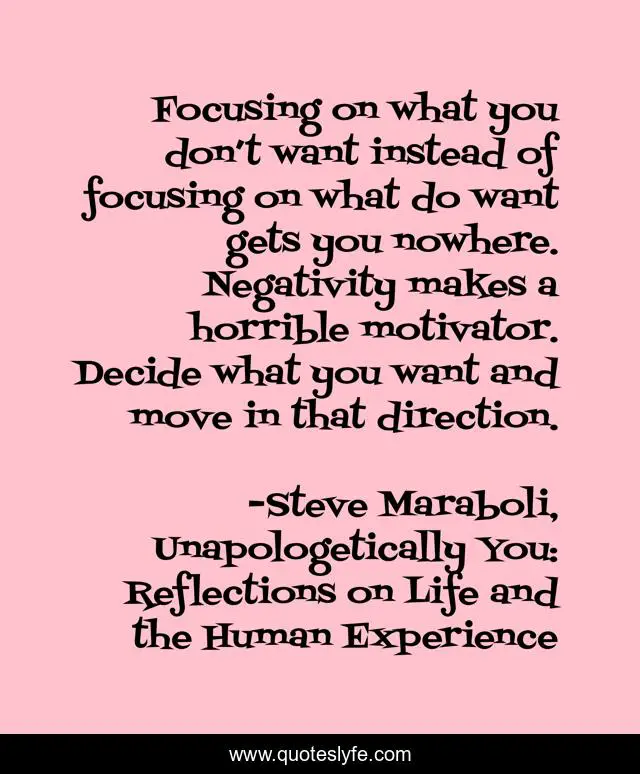 "Steve Maraboli, Unapologetically You: Reflections on Life and the Human Experience Quotes." Quoteslyfe.com, 2025. Sat. 06 Dec. 2025. <https://www.quoteslyfe.com/quote/Focusing-on-what-you-don-t-want-158050>.