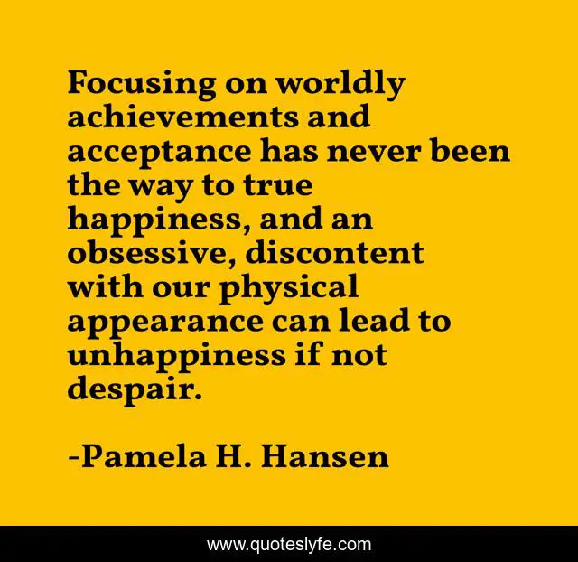 This page presents the quote "Focusing on worldly achievements and acceptance has never been the way to true happiness, and an obsessive, discontent with our physical appearance can lead to unhappiness if not despair.". Author of this quote is Pamela H. Hansen. This quote is about enthusiasm, religious, inspirational,.