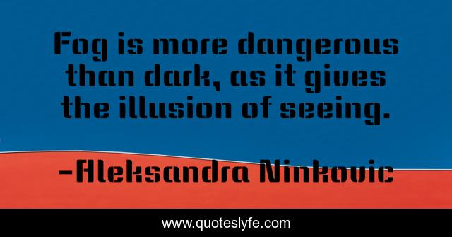 This page presents the quote "Fog is more dangerous than dark, as it gives the illusion of seeing.". Author of this quote is Aleksandra Ninkovic. This quote is about dark, darkness-and-light, illusion, vision, knowledge,.