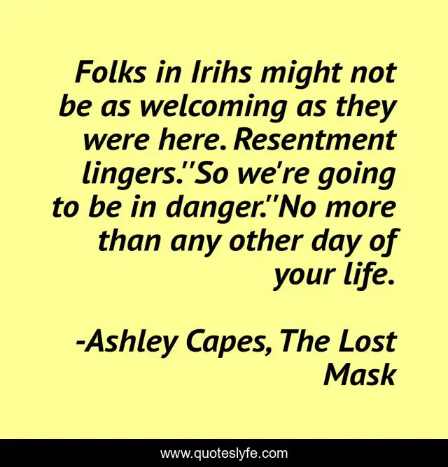 This page presents the quote "Folks in Irihs might not be as welcoming as they were here. Resentment lingers.''So we're going to be in danger.''No more than any other day of your life.". Author of this quote is Ashley Capes, The Lost Mask. This quote is about danger, life, philosophy, wisdom,.