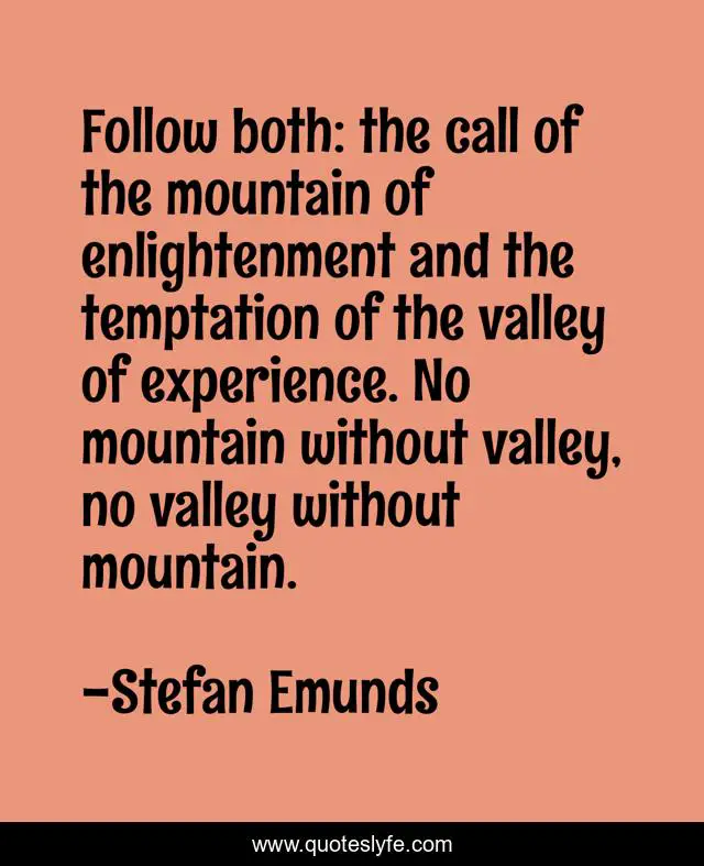 This page presents the quote "Follow both: the call of the mountain of enlightenment and the temptation of the valley of experience. No mountain without valley, no valley without mountain.". Author of this quote is Stefan Emunds. This quote is about life, religion, temptation, experience, wisdom, spirituality, inspirational, enthusiasm, enlightenment,.