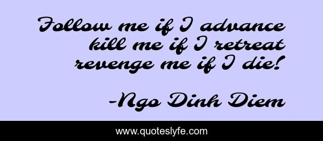 This page presents the quote "Follow me if I advance kill me if I retreat revenge me if I die!". Author of this quote is Ngo Dinh Diem. This quote is about leadership, leaders,.