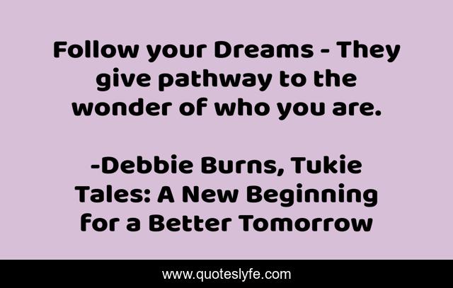 "Debbie Burns, Tukie Tales: A New Beginning for a Better Tomorrow Quotes." Quoteslyfe.com, 2025. Sat. 06 Dec. 2025. <https://www.quoteslyfe.com/quote/Follow-your-Dreams-They-give-pathway-to-53207>.