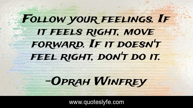 This page presents the quote "Follow your feelings. If it feels right, move forward. If it doesn't feel right, don't do it.". Author of this quote is Oprah Winfrey. This quote is about oprah-winfrey, wisedom, feelings,.