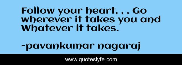 This page presents the quote "Follow your heart, , , Go wherever it takes you and Whatever it takes.". Author of this quote is pavankumar nagaraj. This quote is about heart, life, love, dare-to-win, affection, care,.