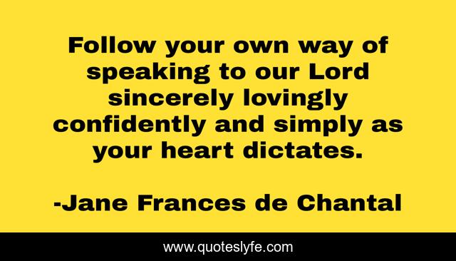 This page presents the quote "Follow your own way of speaking to our Lord sincerely lovingly confidently and simply as your heart dictates.". Author of this quote is Jane Frances de Chantal. .
