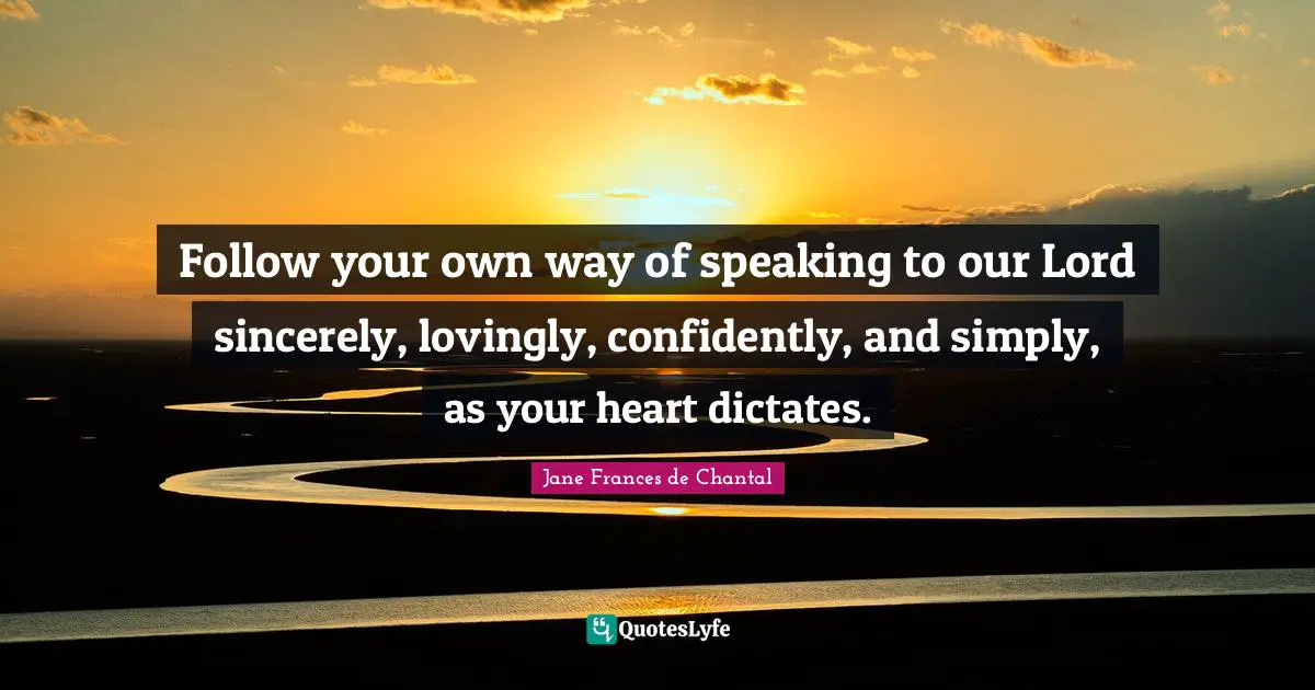 This page presents the quote "Follow your own way of speaking to our Lord sincerely, lovingly, confidently, and simply, as your heart dictates.". Author of this quote is Jane Frances de Chantal. This quote is about way, lord, our lord, sincerely, heart,.