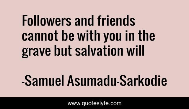 This page presents the quote "Followers and friends cannot be with you in the grave but salvation will". Author of this quote is Samuel Asumadu-Sarkodie. This quote is about proverbs, words-of-knowledge, discernment, parables, words-of-wisdom, inspiration,.