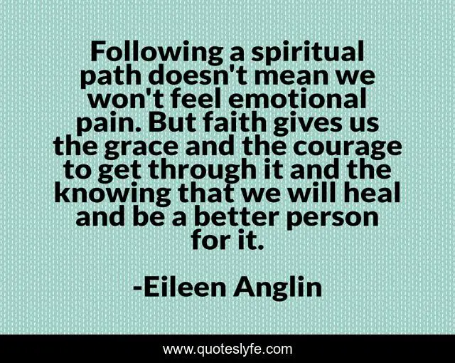 This page presents the quote "Following a spiritual path doesn't mean we won't feel emotional pain. But faith gives us the grace and the courage to get through it and the knowing that we will heal and be a better person for it.". Author of this quote is Eileen Anglin. This quote is about spiritual-growth, spiritual, spiritual-life,.