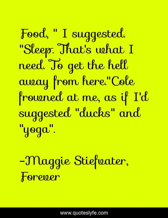 This page presents the quote "Food, " I suggested. "Sleep. That's what I need. To get the hell away from here."Cole frowned at me, as if I'd suggested "ducks" and "yoga".". Author of this quote is Maggie Stiefvater, Forever. This quote is about forever, cole-st-clair, ducks, sleep, isabel-culpeper, humor,.