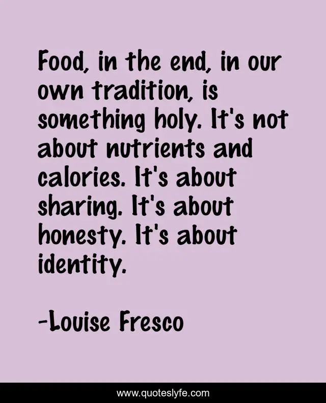 This page presents the quote "Food, in the end, in our own tradition, is something holy. It's not about nutrients and calories. It's about sharing. It's about honesty. It's about identity.". Author of this quote is Louise Fresco. This quote is about end, honesty, identity,.