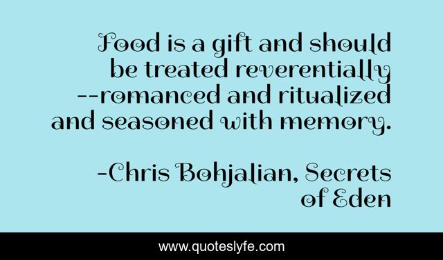 This page presents the quote "Food is a gift and should be treated reverentially--romanced and ritualized and seasoned with memory.". Author of this quote is Chris Bohjalian, Secrets of Eden. .