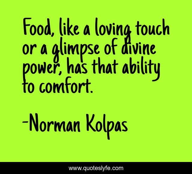 This page presents the quote "Food, like a loving touch or a glimpse of divine power, has that ability to comfort.". Author of this quote is Norman Kolpas. .
