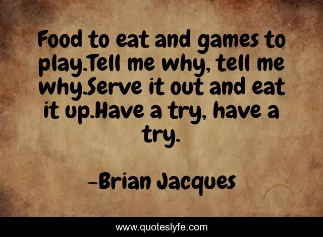 This page presents the quote "Food to eat and games to play.Tell me why, tell me why.Serve it out and eat it up.Have a try, have a try.". Author of this quote is Brian Jacques. This quote is about fun, feast, games,.