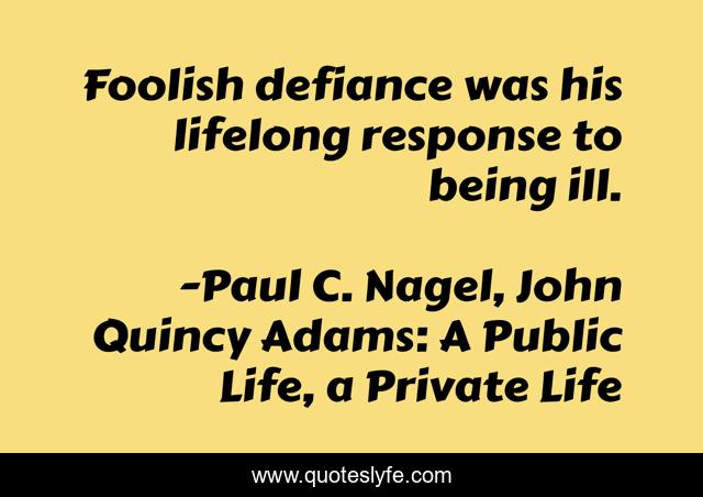 This page presents the quote "Foolish defiance was his lifelong response to being ill.". Author of this quote is Paul C. Nagel, John Quincy Adams: A Public Life, a Private Life. This quote is about flesh, fallibility, pride, fragility, humility,.