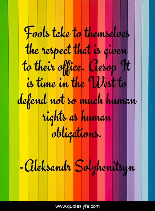 This page presents the quote "Fools take to themselves the respect that is given to their office. Aesop It is time in the West to defend not so much human rights as human obligations.". Author of this quote is Aleksandr Solzhenitsyn. This quote is about society, social,.