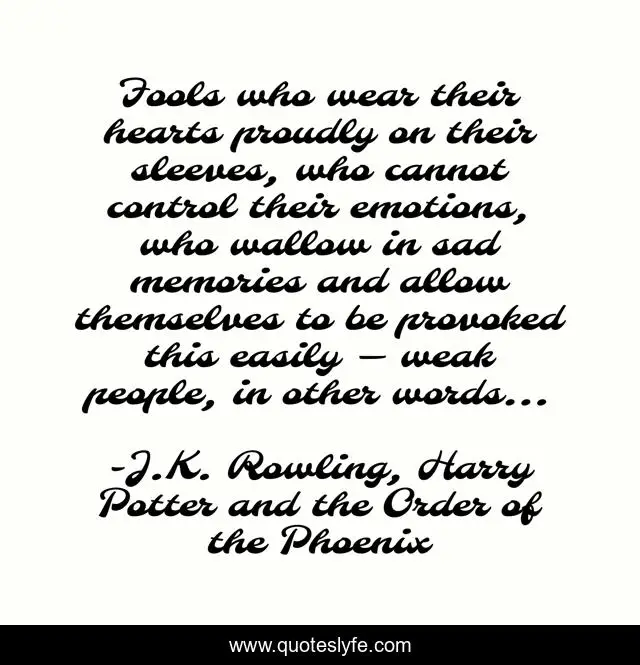 This page presents the quote "Fools who wear their hearts proudly on their sleeves, who cannot control their emotions, who wallow in sad memories and allow themselves to be provoked this easily — weak people, in other words...". Author of this quote is J.K. Rowling, Harry Potter and the Order of the Phoenix. .