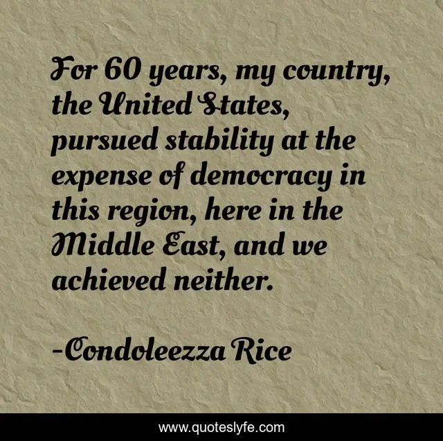 This page presents the quote "For 60 years, my country, the United States, pursued stability at the expense of democracy in this region, here in the Middle East, and we achieved neither.". Author of this quote is Condoleezza Rice. This quote is about arab-world, democracy,.