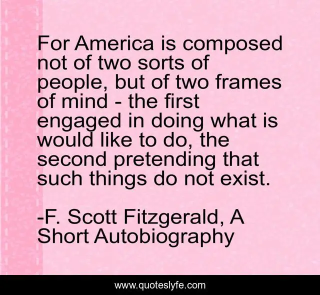 This page presents the quote "For America is composed not of two sorts of people, but of two frames of mind - the first engaged in doing what is would like to do, the second pretending that such things do not exist.". Author of this quote is F. Scott Fitzgerald, A Short Autobiography. This quote is about america, people,.