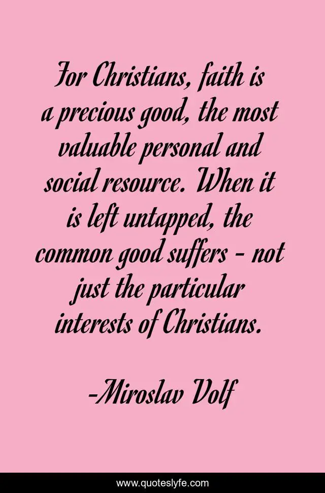 This page presents the quote "For Christians, faith is a precious good, the most valuable personal and social resource. When it is left untapped, the common good suffers - not just the particular interests of Christians.". Author of this quote is Miroslav Volf. This quote is about personal, precious, good,.