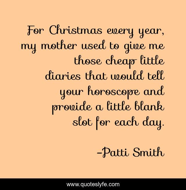 This page presents the quote "For Christmas every year, my mother used to give me those cheap little diaries that would tell your horoscope and provide a little blank slot for each day.". Author of this quote is Patti Smith. This quote is about me, day, mother,.