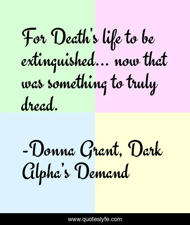 This page presents the quote "For Death's life to be extinguished... now that was something to truly dread.". Author of this quote is Donna Grant, Dark Alpha’s Demand. This quote is about death, dragon-kings, reapers, paranormal-romance, fae,.