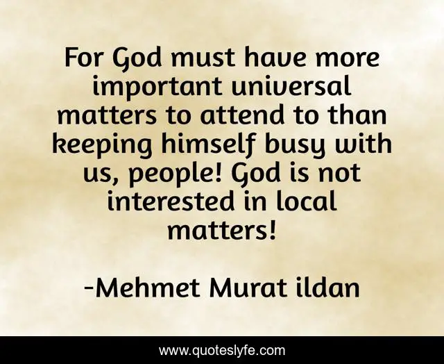 This page presents the quote "For God must have more important universal matters to attend to than keeping himself busy with us, people! God is not interested in local matters!". Author of this quote is Mehmet Murat ildan. .