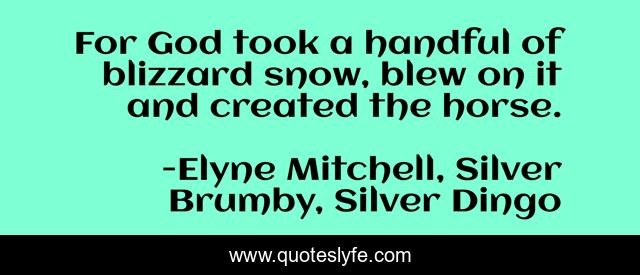This page presents the quote "For God took a handful of blizzard snow, blew on it and created the horse.". Author of this quote is Elyne Mitchell, Silver Brumby, Silver Dingo. This quote is about breath, horse, creation, snow,.