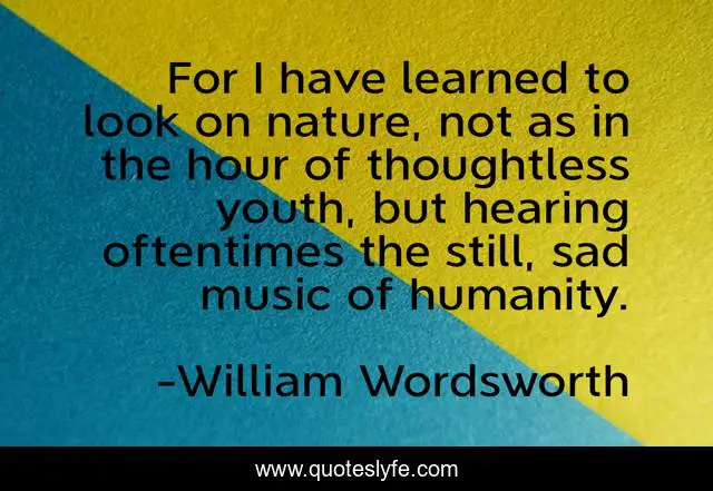 This page presents the quote "For I have learned to look on nature, not as in the hour of thoughtless youth, but hearing oftentimes the still, sad music of humanity.". Author of this quote is William Wordsworth. This quote is about music, humanity, sad,.