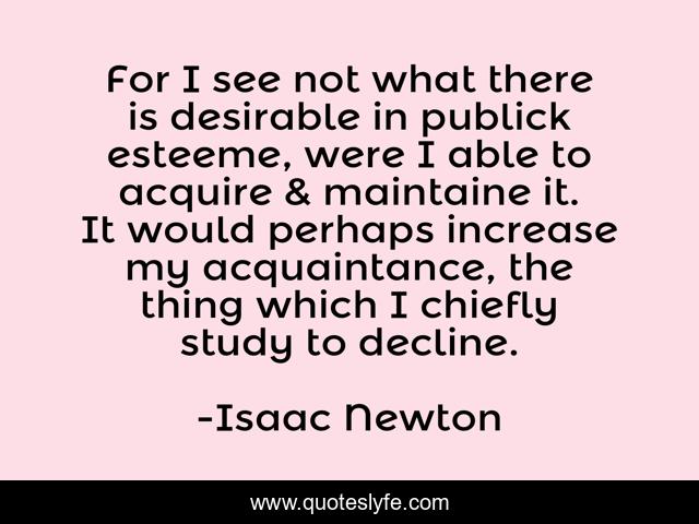 This page presents the quote "For I see not what there is desirable in publick esteeme, were I able to acquire & maintaine it. It would perhaps increase my acquaintance, the thing which I chiefly study to decline.". Author of this quote is Isaac Newton. This quote is about fame, introversion,.