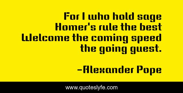This page presents the quote "For I who hold sage Homer's rule the best Welcome the coming speed the going guest.". Author of this quote is Alexander Pope. .