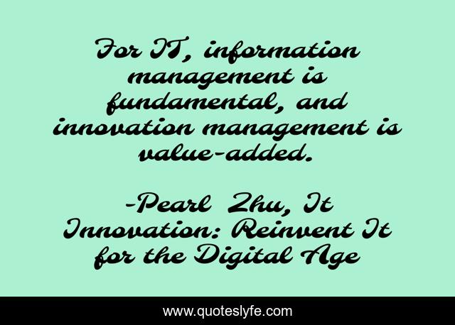 This page presents the quote "For IT, information management is fundamental, and innovation management is value-added.". Author of this quote is Pearl Zhu, It Innovation: Reinvent It for the Digital Age. This quote is about it-innovation, innovation,.