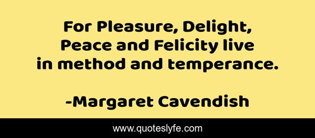 This page presents the quote "For Pleasure, Delight, Peace and Felicity live in method and temperance.". Author of this quote is Margaret Cavendish. This quote is about delight, pleasure, live,.
