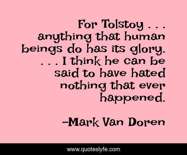 This page presents the quote "For Tolstoy . . . anything that human beings do has its glory. . . . I think he can be said to have hated nothing that ever happened.". Author of this quote is Mark Van Doren. This quote is about curiosity, interest, writing,.