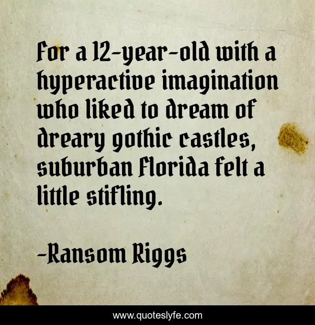 This page presents the quote "For a 12-year-old with a hyperactive imagination who liked to dream of dreary gothic castles, suburban Florida felt a little stifling.". Author of this quote is Ransom Riggs. This quote is about castles, little, dream,.