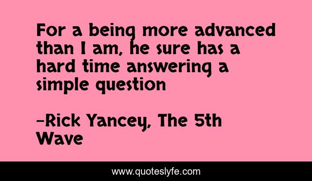 This page presents the quote "For a being more advanced than I am, he sure has a hard time answering a simple question". Author of this quote is Rick Yancey, The 5th Wave. This quote is about funny, being, aliens, the5thwave, comedy, smart,.