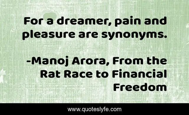 This page presents the quote "For a dreamer, pain and pleasure are synonyms.". Author of this quote is Manoj Arora, From the Rat Race to Financial Freedom. This quote is about pleasure, synonyms, dreamers, pain, dreamer,.