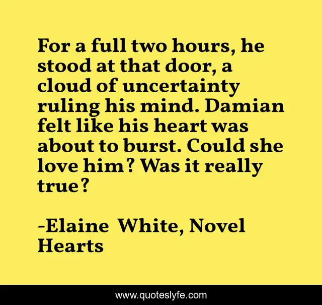 This page presents the quote "For a full two hours, he stood at that door, a cloud of uncertainty ruling his mind. Damian felt like his heart was about to burst. Could she love him? Was it really true?". Author of this quote is Elaine White, Novel Hearts. This quote is about loss, love, challenge, paranormal, valentine, romance, vampire, unrequited-love, battle,.
