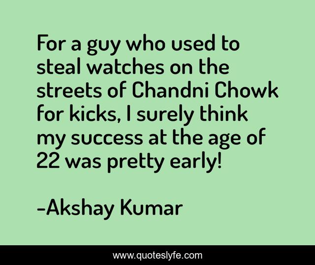 This page presents the quote "For a guy who used to steal watches on the streets of Chandni Chowk for kicks, I surely think my success at the age of 22 was pretty early!". Author of this quote is Akshay Kumar. This quote is about success, watches, think,.