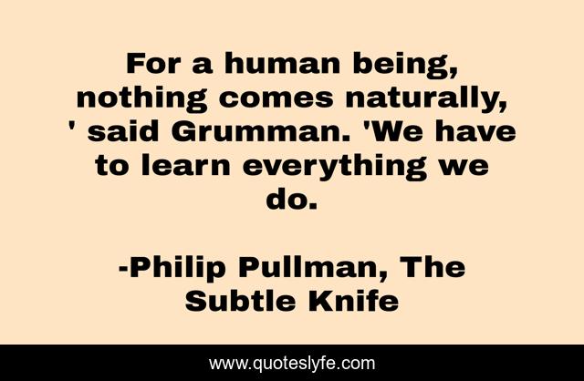 This page presents the quote "For a human being, nothing comes naturally, ' said Grumman. 'We have to learn everything we do.". Author of this quote is Philip Pullman, The Subtle Knife. This quote is about instinct, humans, learning,.