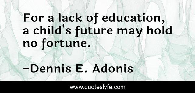 This page presents the quote "For a lack of education, a child's future may hold no fortune.". Author of this quote is Dennis E. Adonis. This quote is about life, study, philosophy, school, wisdom, behave, college, fail, failures,.
