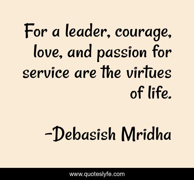 This page presents the quote "For a leader, courage, love, and passion for service are the virtues of life.". Author of this quote is Debasish Mridha. This quote is about courage, life, education, love, knowledge, service, intelligence, philosophy, virtues,.