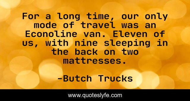 This page presents the quote "For a long time, our only mode of travel was an Econoline van. Eleven of us, with nine sleeping in the back on two mattresses.". Author of this quote is Butch Trucks. This quote is about long time, long, time,.