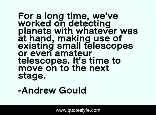 This page presents the quote "For a long time, we've worked on detecting planets with whatever was at hand, making use of existing small telescopes or even amateur telescopes. It's time to move on to the next stage.". Author of this quote is Andrew Gould. This quote is about small, long, time,.